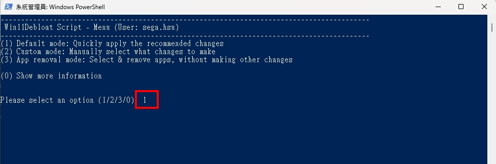 請輸入1,它就是這個腳本內鍵預設的把windows11預設的小軟體都移除