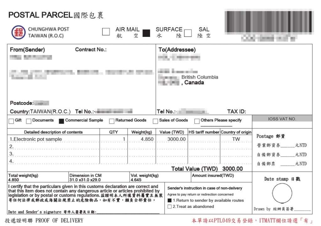 因緣際會需要運送一個電鍋到加拿大溫哥華,我最後決定用咱台灣的郵局運輸,運費最省,但是時效就不大一定,但是總是會運到