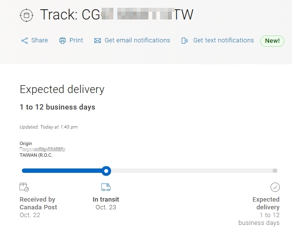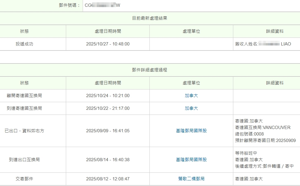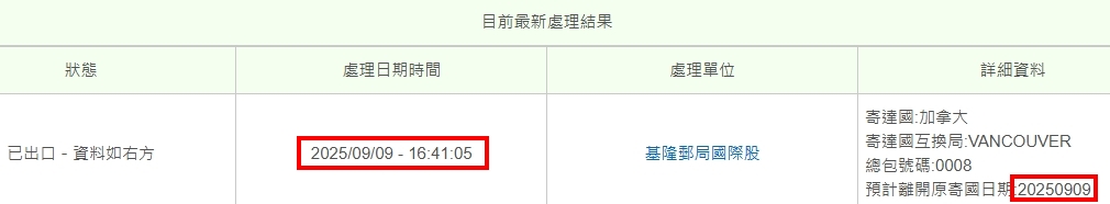 我到加拿大郵局查詢我的快遞單號可以查詢到資料,這表示台灣郵局已經把資料拋轉給加拿大郵局了