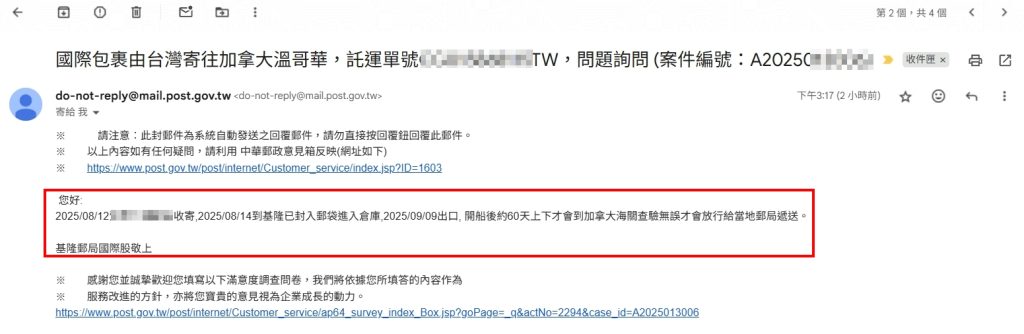 我默默的等待,已經等到八月底,都沒有看到我的電鍋有出港的跡象,我就寫信給郵局問問我這單號的貨物是何時可以出港? 下面就是郵局來的回信