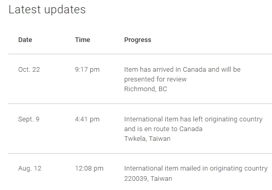10/22 海關把電鍋拋轉給加拿大郵局,並暫存在Richmond郵局