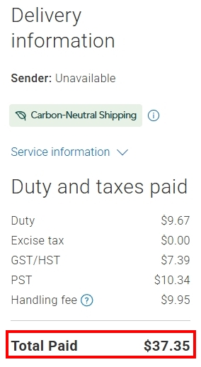 這次的運送,因為我的報關單上寫著”電鍋樣品“可能因為是樣品(是新品)所以被打稅!,這稅金還不便宜,加幣$37.35元