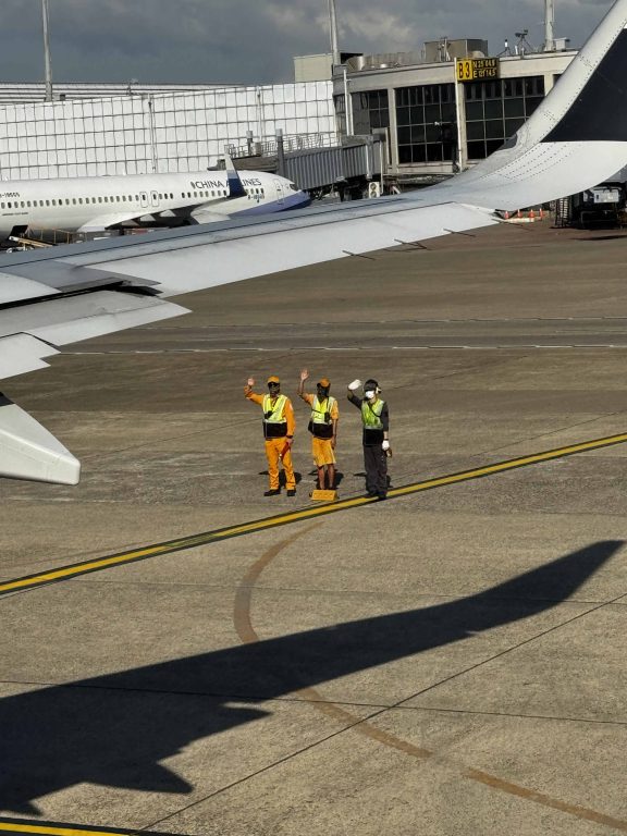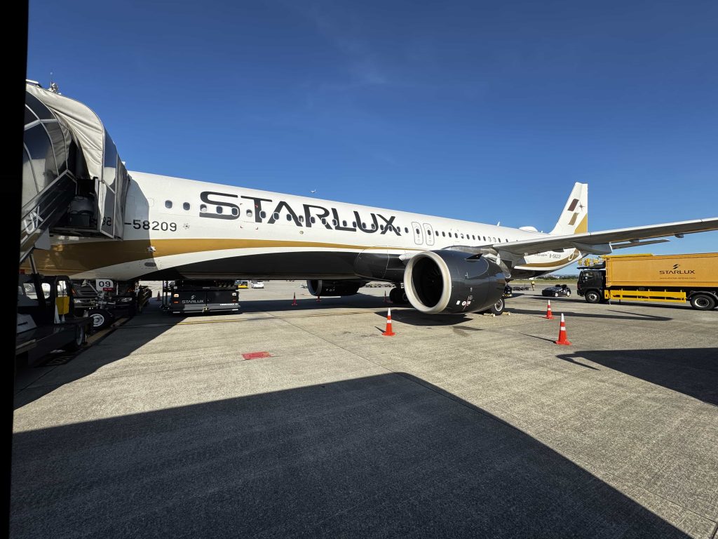 登機了,飛機後推,地勤揮手再見,我們今天搭的是STARLUX星宇航空JX715號班機,航程大約3小時。