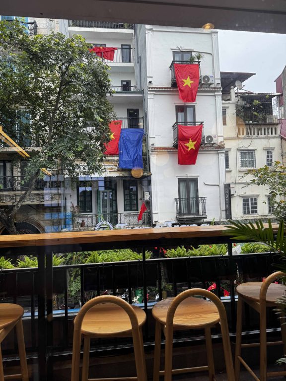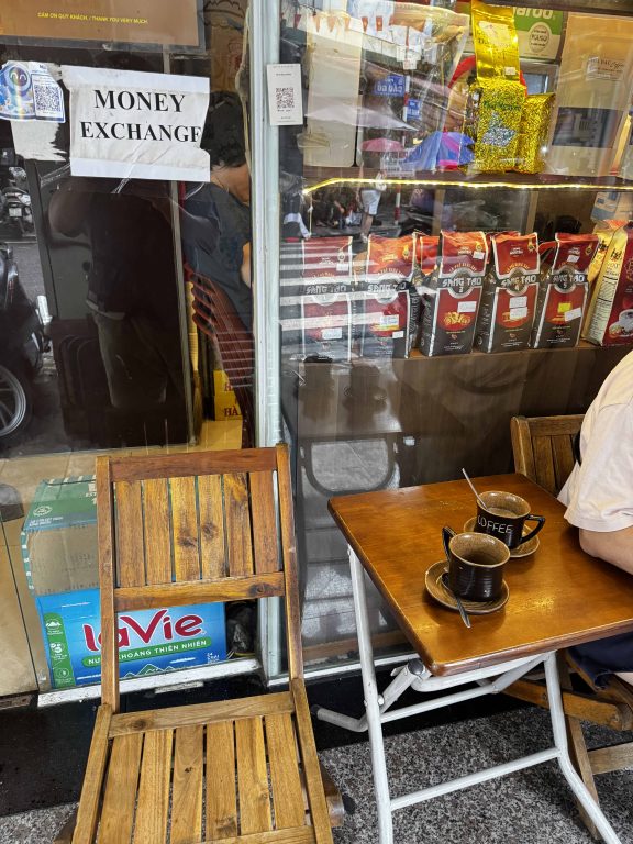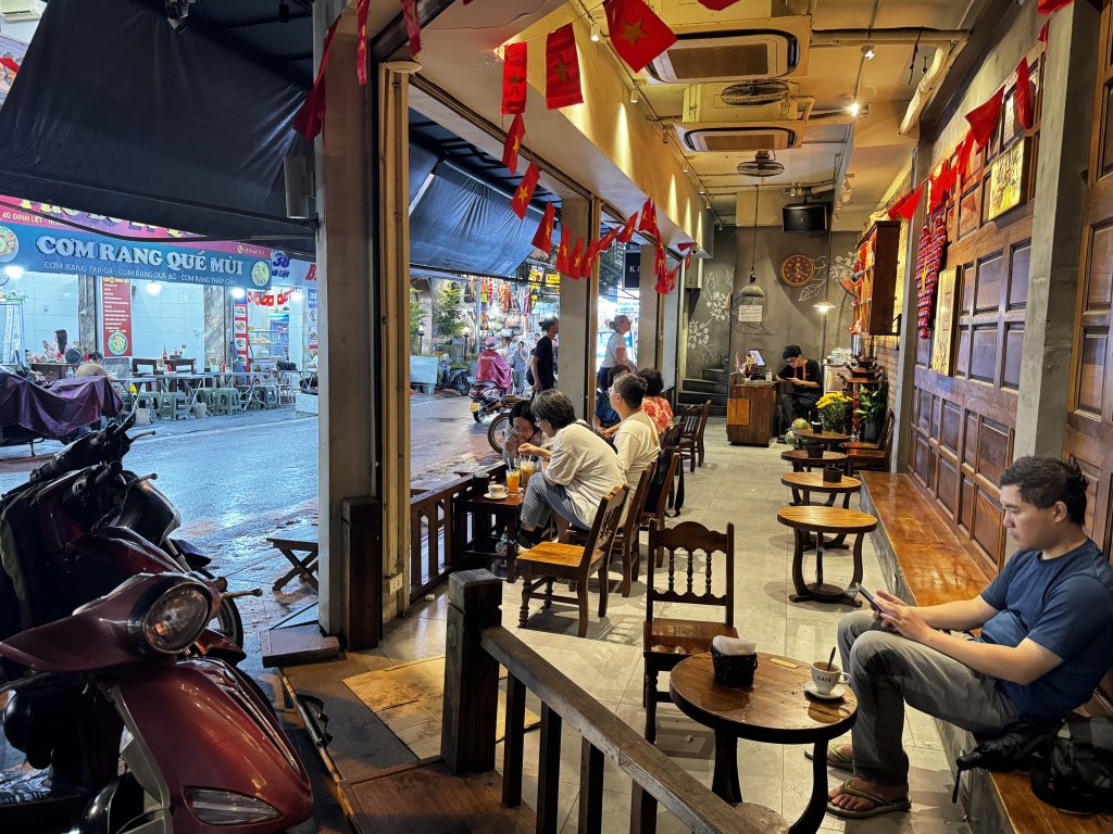 他們越南的街邊咖啡店大多就都是坐著矮凳矮桌就喝起咖啡談起事情來,我們也入境隨俗點杯咖啡坐在騎樓的凳子上看著車水馬龍喇叭的叭叭聲不絕於耳的街道與下著滂沱大雷雨的天空,就這樣一直坐到快要中午。