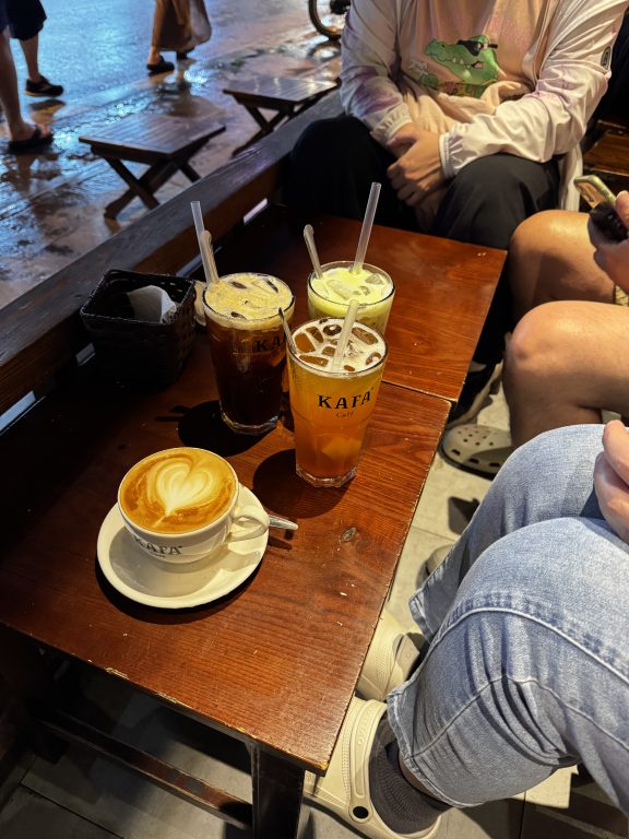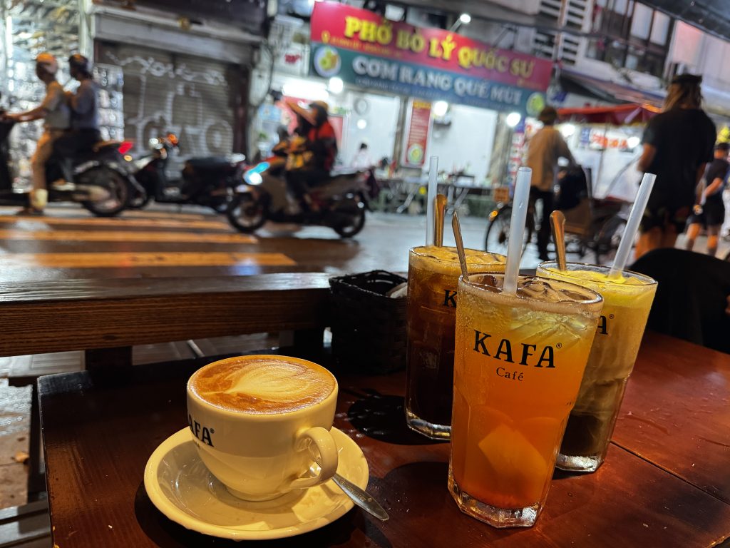 吃完晚餐要消消食,走走逛逛,反正時間還早,後來找到一個咖啡廳,體驗一下越南啡廳是啥樣子的? KAFA Cafe,越南的咖啡廳大多都是在騎樓上喝著的,擺著小板凳小桌子這樣,我們入境隨俗也點了咖啡與飲料看著熙來人往叭叭叭的機車與過馬路的路人。