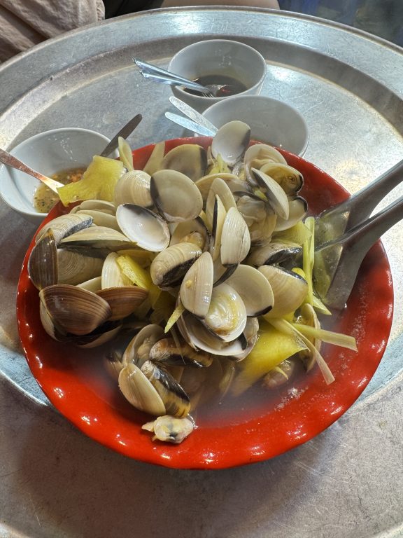 按摩完,回hotel梳洗一下,然後出來找晚餐,今天晚餐吃了兩個地方,第一個是下面這個烤海鮮的,所有的海鮮食物都是現烤,非常新鮮好吃,這家店是晚上初攤擺在騎樓上的,我沒有找到他gppgle maps的定位,但是我可以確定的是就是在 Mỳ vằn thắn Mỳ Khô Cầu Gỗ這家麵店的旁邊大約20米處
