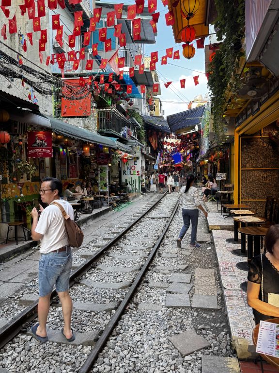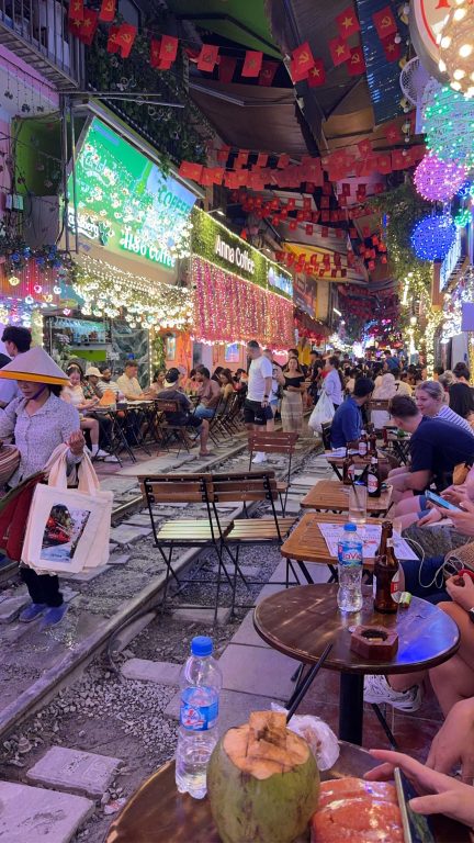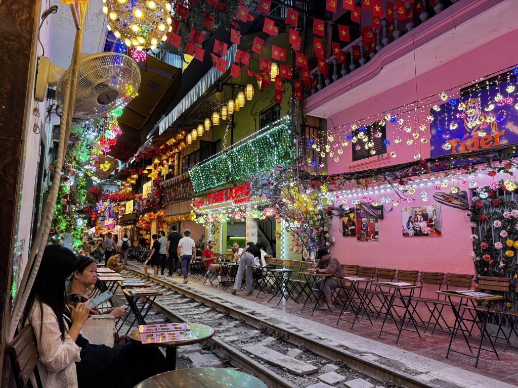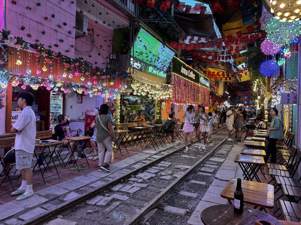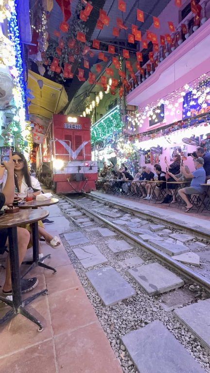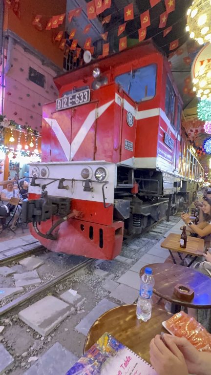 這個火車街,火車經過,真得如同你在YT上面看到的就是近在咫尺,你不要想去摸火車,以火車的慣性定律來說,你一個肉身或是物品被這樣慢速火車撞到嚴重的話也是會死亡的,受傷更不在話下,所以請聽從店家指示,收好自己的桌子,管好自己的雙手,還有你的那顆頭顱,不然被火車尻到,是可大可小的,出來旅遊嘛大家都務必小心,快樂出門平安回家,您們說對不對R。