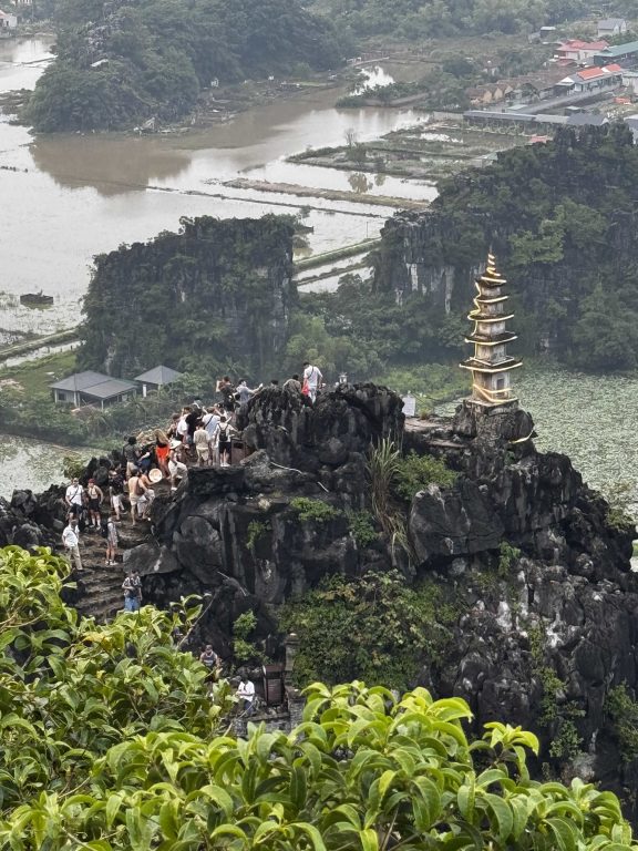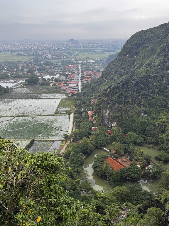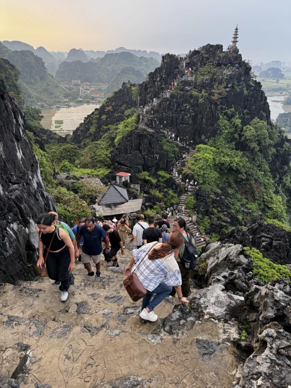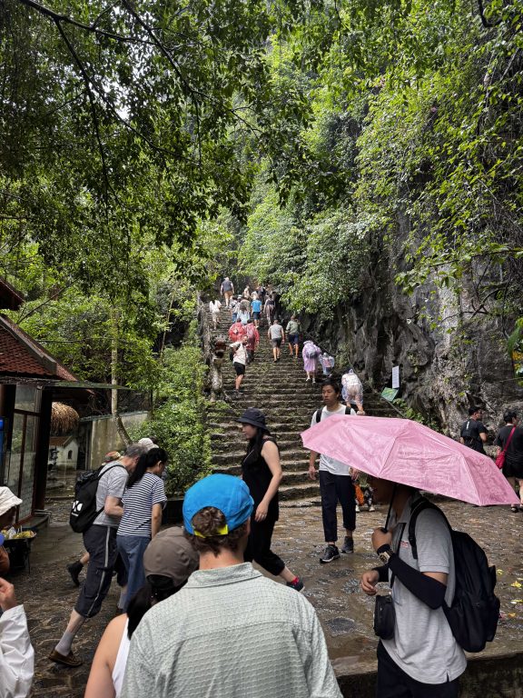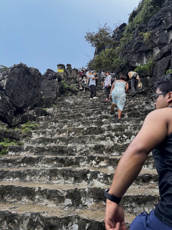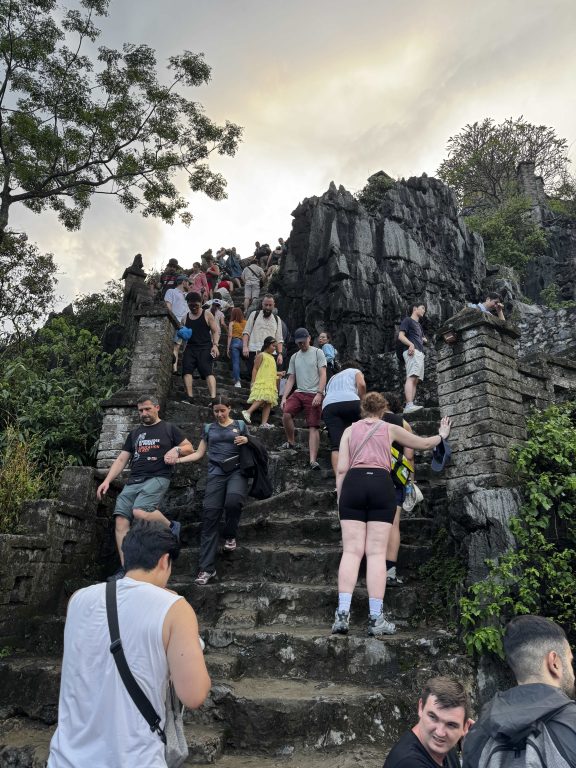 爬山的這一天,這個時候剛剛才下完一場滂沱的午後雷陣雨,我上山的同時看見擦肩而過的遊客都是狼狽不勘,當我走上階梯,我才知道因為步道階梯規劃的不是讓人類很好走(階高很高,階身也深)就很陡,上山還OK,下山加上地上有個各國遊客踩過的水,雖然不至於泥濘但是因為階高,所以非常滑溜,每下一步都需要捻力,不可以直接下力,直接下力你就會滑倒甚至是滾下山。這臥龍山有兩個山峰,左邊的是龍盤踞在山頂,這比較高,右邊山頂是有一座塔這略龍邊低些,我選擇走左邊,攻頂後有涼亭,可以看到剛剛中午騎腳踏車的那個公園Bến Thánh如下圖