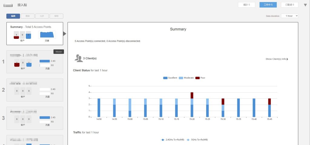如果你有一台一上的R310或是其他型號的Ruckus AP的話,請都刷成Unleashed模式,並將這些AP都以有線網路的方式開機,開機後你只要登入其中一台Ruckus的AP你就可以從GUI的中控台上看到所有AP並統一管理 (下面這張圖 你看左邊有四台AP納管)