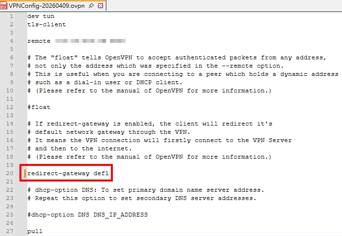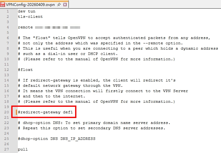 找到第20行的 #redirect-gateway local def1,注意看它最左邊有一個#字號,請將這#字移除(移除表示啟用),然後存檔